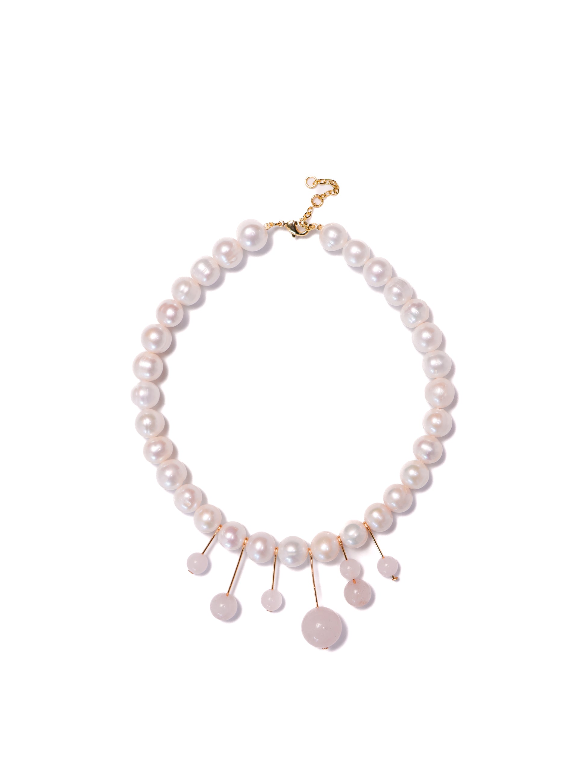 Material: fresh water pearls, rose quartz, 18kt gold vermeil