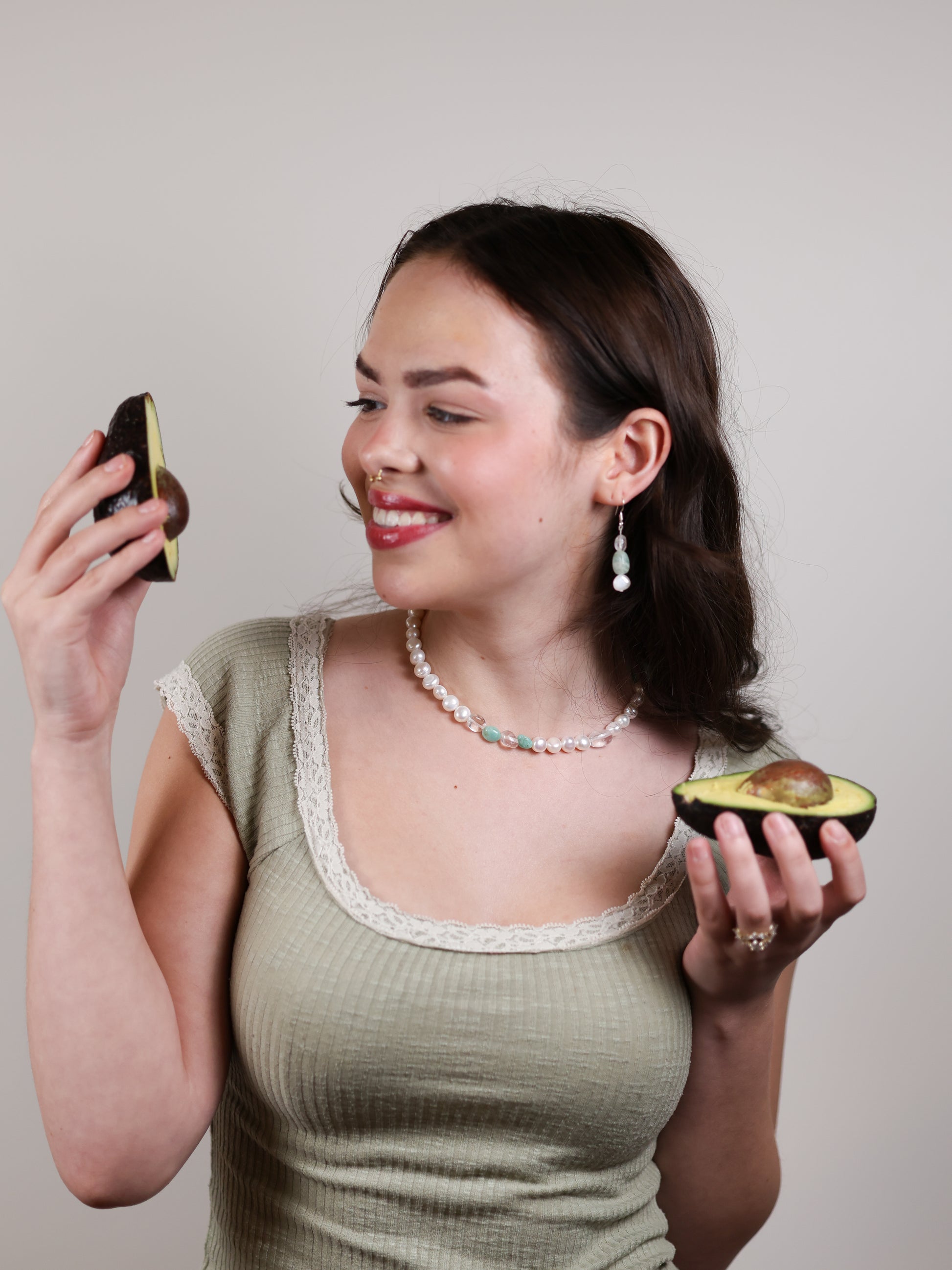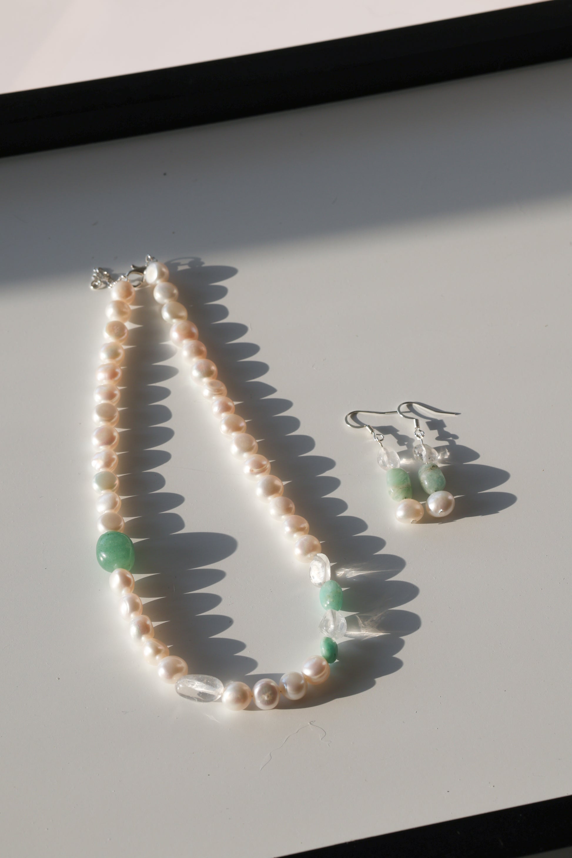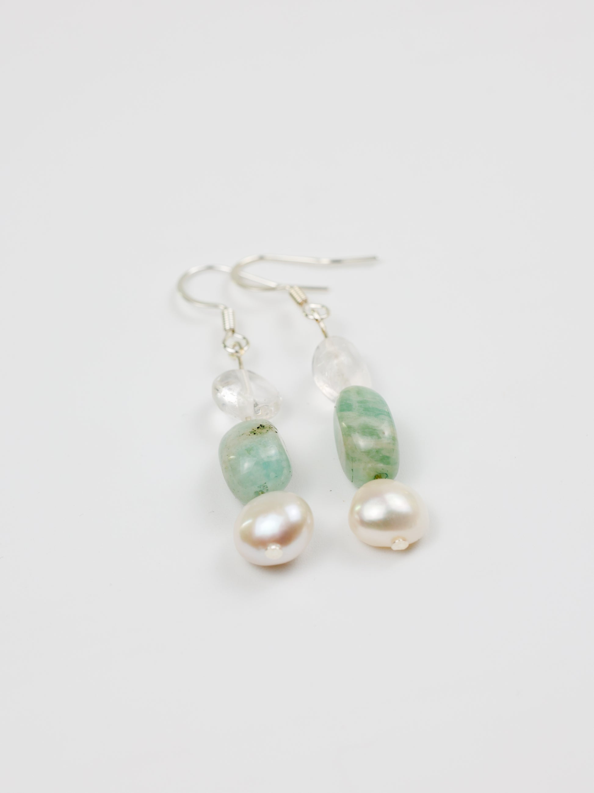 Material: Freshwater Pearl, amazonite, clear quartz, silver vermeil