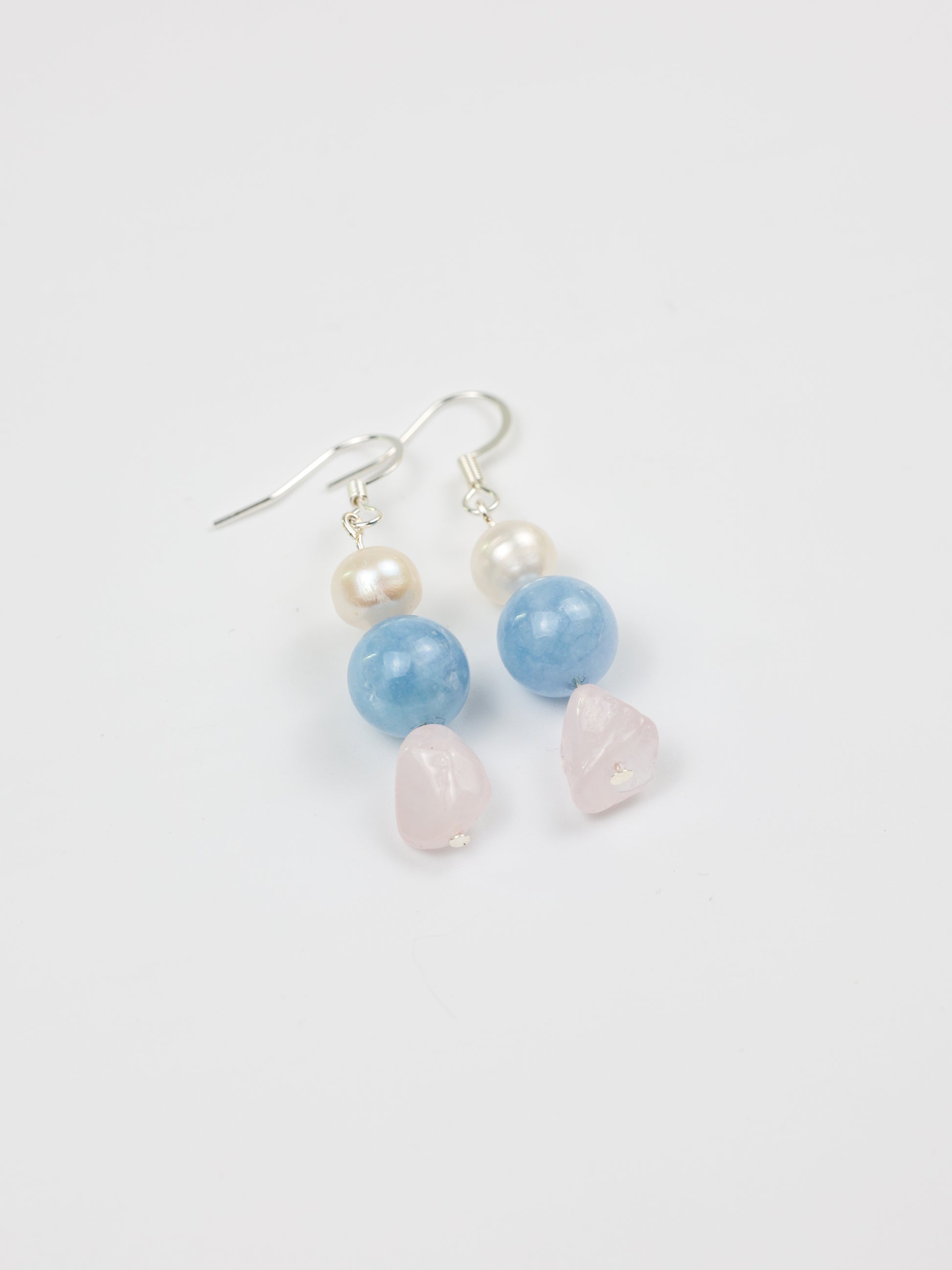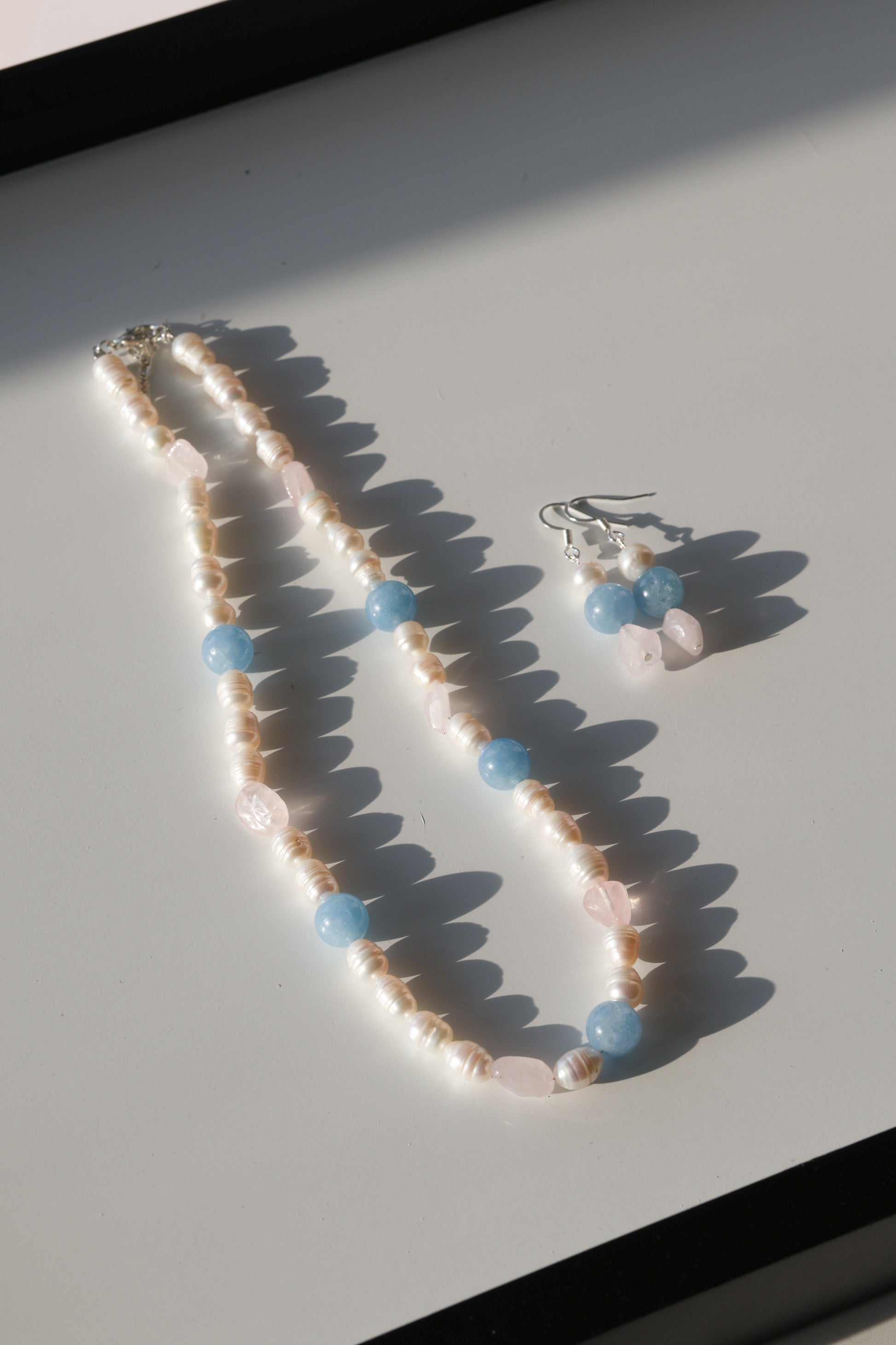 Material: freshwater pearls, aquamarine, rose quartz, silver vermeil
