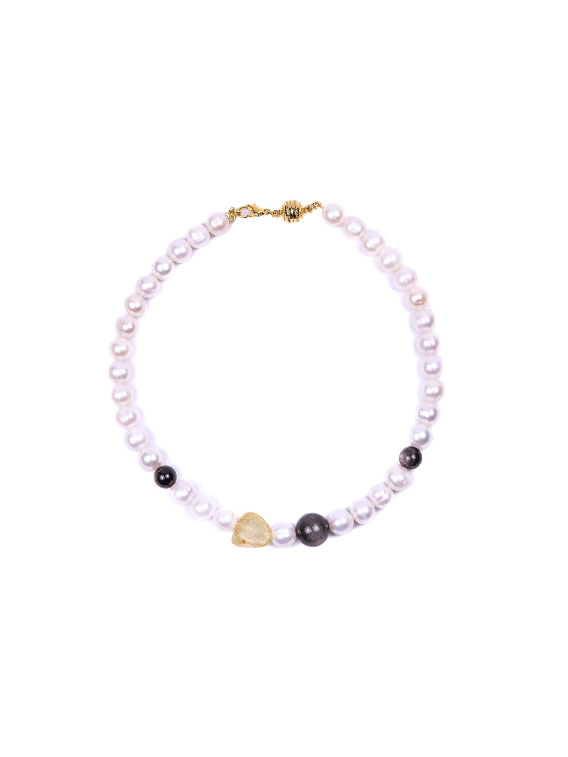 Material: freshwater pearls, obsidian, citrine, 18kt gold vermeil
